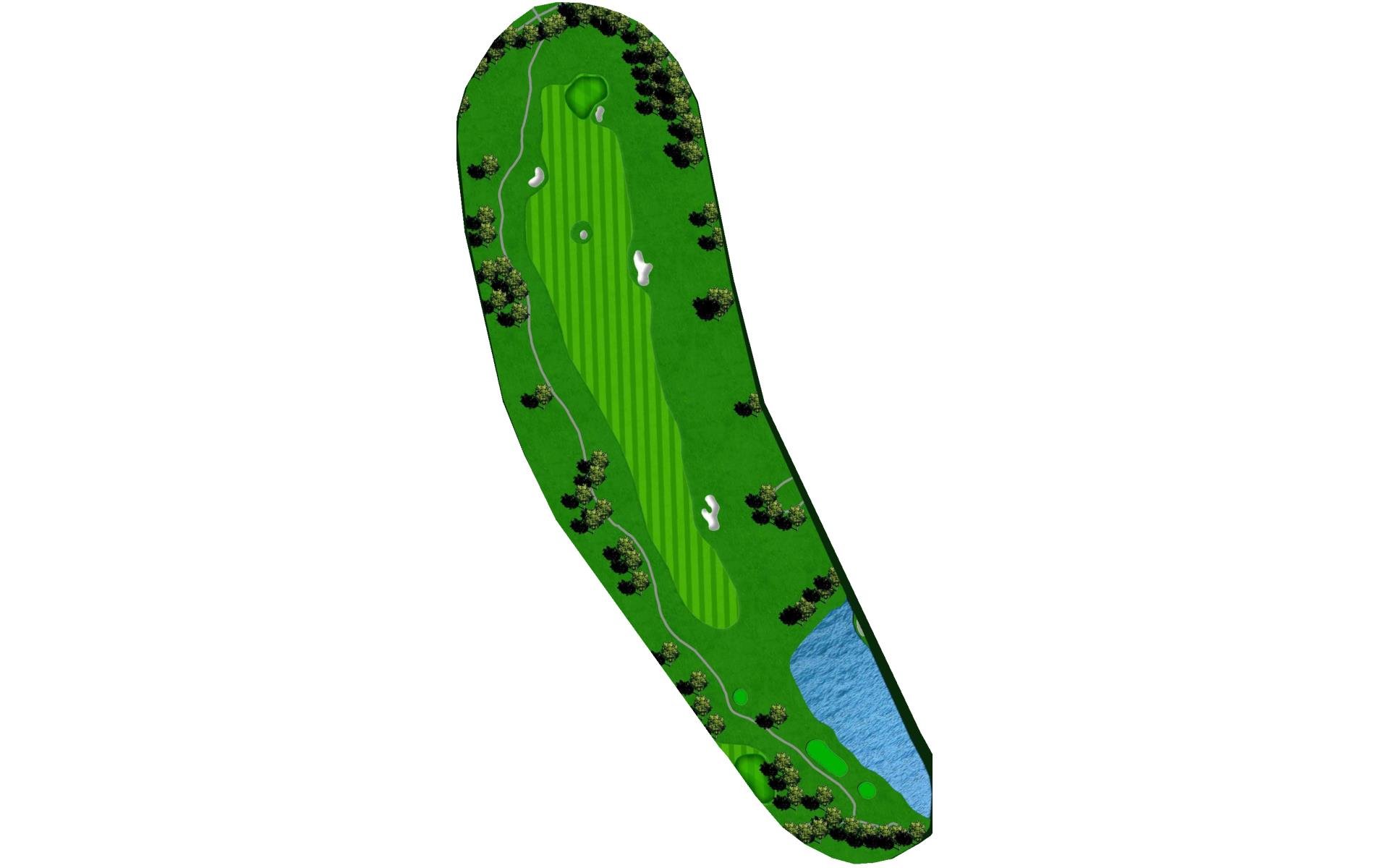 | This long dogleg left par 4 requires players to carry the water on their drive to a landing area flanked by fairway bunkers. The approach shot must avoid the large greenside bunker on the left. |